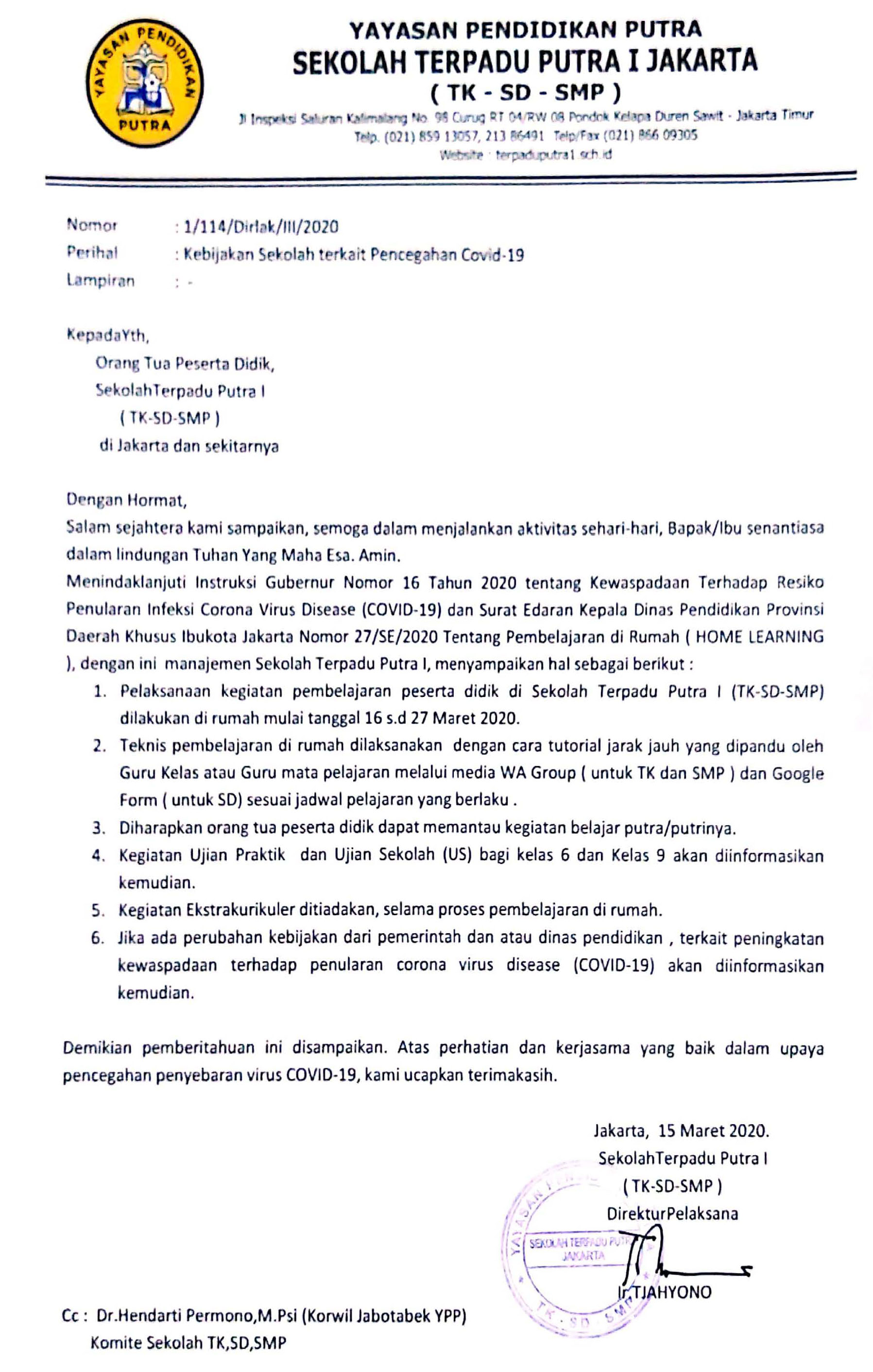 Menindaklanjuti instruksi Gubernur DKI Jakarta Nomor 16 Tahun 2020 tentang Kewaspadaan Terhadap Resiko Penularan Infeksi Corona Virus Disease (COVID-19) dan Surat Edaran Kepala Dinas Pendidikan Provinsi Daerah Khusus Ibukota Jakarta Nomor 27/SE/2020 tentang Pembelajaran di rumah (home learning) maka Manajemen Sekolah Terpadu Putra 1 menginstruksikan kepada seluruh peserta didik di Sekolah Terpadu Putra 1 untuk melaksanakan pembelajaran di rumah mulai tanggal 16 s.d. 27 Maret 2020. Teknis pembelajaran diatur oleh masing-masing unit. Di atas itu adalah surat lengkap yang ditandatangani oleh Direktur Sekolah Terpadu Putra 1, Ir. Tjahyono.